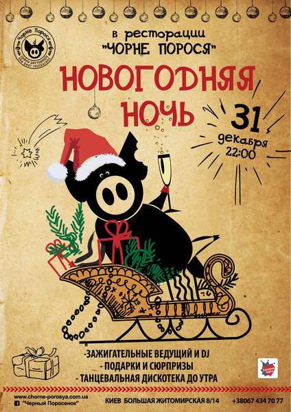 Встречайте Новогоднюю ночь  вместе с пивной ресторацией «Чорне Порося»  в атмосфере невероятного веселья, хорошего настроения и новогодней сказки! В эту ночь Вас ожидают: