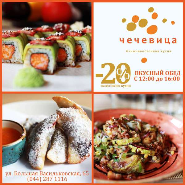 | 30.09.2013 | Кухню ресторана Чечевица отличает широкий выбор блюд ближневосточной кухни. А кулинарные творения шеф - повара Артема Оранского, искусно воплощающего традиции ближнего Востока никого не оставят равнодушными. Удовлетворить капризы любого гурмана и попробовать больше разнообразных блюд теперь вы можете со скидкой -20% каждый день с 12:00 до 16:00! Не отказывайте себе в удовольствии вкусно отобедать вместе с нами!