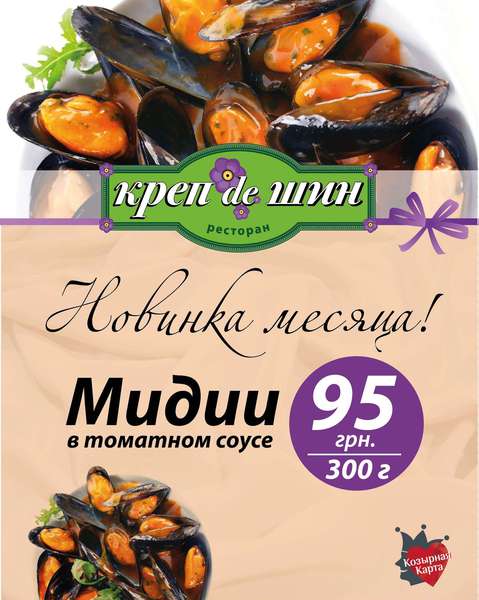 Ресторан Креп де Шин приглашает гостей насладиться неповторимым деликатесом – мидиями в томатном соусе! Нежный и удивительный вкус этих моллюсков сделает ваш ужин незабываемым! Не стоит также забывать и о пользе этого блюда: будучи весьма малокалорийным, оно прекрасно утоляет голод, а также содержит большое количество белков, витаминов и минералов.
