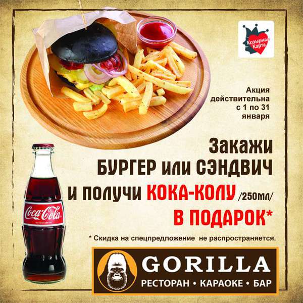 В январе заказывай хрустящие сэндвичи или вкуснейшие бургеры в ресторане-караоке-баре GORILLA и получи COCA-COLA ( 250 мл) в ПОДАРОК.*