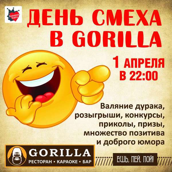 Приходи 1 апреля в ресторан-караоке-барGORILLA – будем отрываться по полной! Валяние дурака, розыгрыши, конкурсы, приколы, призы, множество позитива и доброго юмора… Ну, и не совсем доброго тоже!