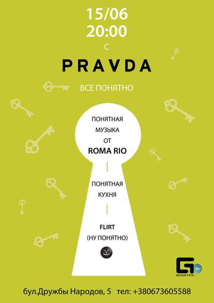 Понятная музыка, кухня каждого дня, танцы до утра и flirt (это понятно)! ☺ Всех, кто ценит комфорт, веселье и вкус - приглашаем в гости! Да, кстати, у нас новое меню, которое сделает вас счастливыми! Музыкальное настроение создает Roma Rio. До встречи в Pravda Bar!