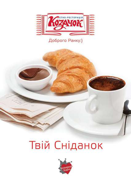 Кажуть, що звичка переносити самий грунтовний прийом їжі на ранок - секрет багатьох успішних бізнесменів. Фірмові сніданки в ресторанах Козачок просто створені для любителів поснідати по-справжньому цільно. З самого ранку тут пахне сирничками, круасанами та справжнью домашньою яєчнею. Твій ранок може бути на будь-який смак та гаманець, тому що у нас діє знижка 25% з 6.00 до 11.00 години дня.