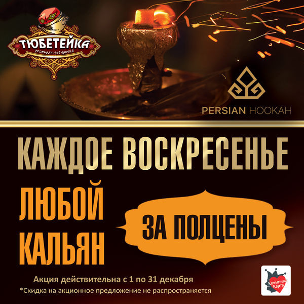 Только в декабре, каждое воскресенье заказывайте любой кальян за полцены в ресторане Тюбетейка на Тарасовской.
