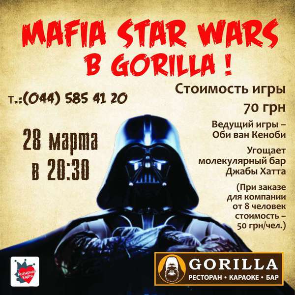 28 марта в 20:30 ресторан-караоке-бар GORILLA приглашает тебя поучаствовать фантастическо-психологической игре «Мафия. Звездные войны»!
