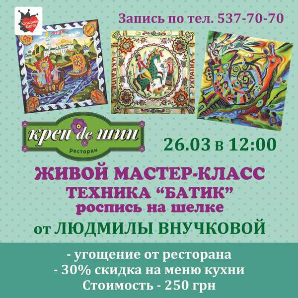 26 марта в 12:00 ресторан Креп де Шин приглашает Вас на мастер-класс техника "Батик" Людмилы Внучковой