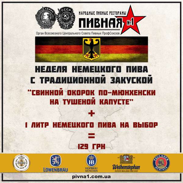 На этой неделе в Пивной №1 на Бассейной и Пивной №1 на Оболони действует специальное предложение - “свинной окорок по-мюнхенски на тушеной капусте” + 1 литр немецкого пива на выбор = 129 грн.