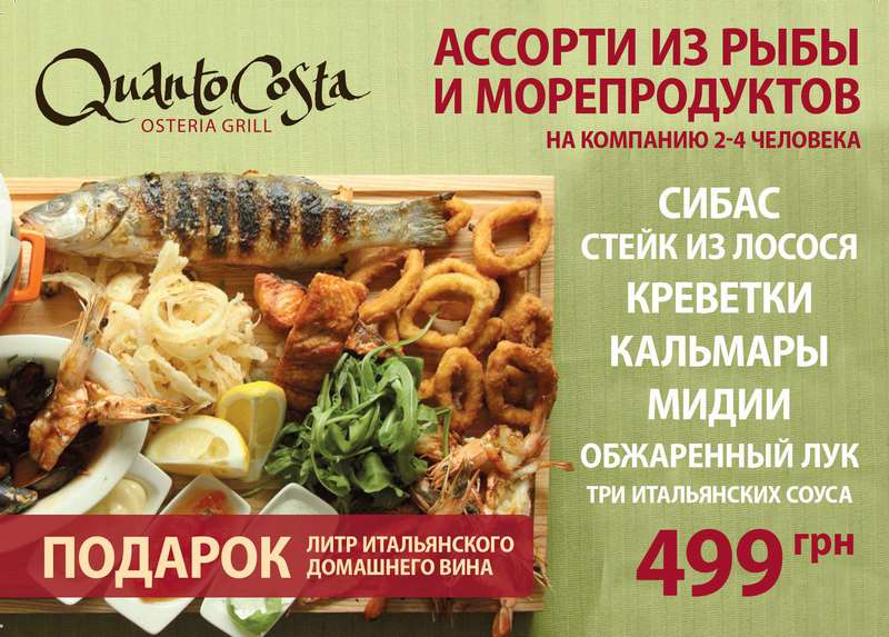 Остерия гриль Quanto Costa приглашает большие и шумные компании на вечерние посиделки. Специально для них в ресторане приготовили два вида ассорти – мясное и рыбное. Каждое ассорти весом больше одного килограмма и насытит до четырех человек. Кроме того, в ресторане с радостью угостят графином белого или красного вина к такому ассорти