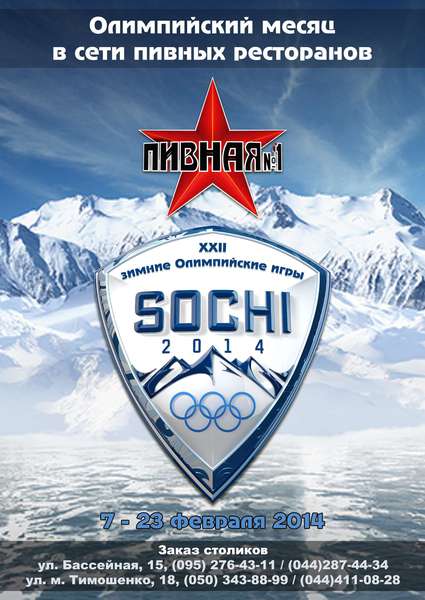 Пивная №1 Бассейной и «Пивная №1» на Оболони приглашают с 7-го по 23-е февраля на прямые трансляции 22-х зимних Олимпийских игр в Сочи.