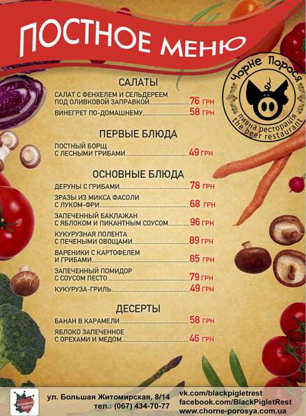 Великий пост в самом разгаре, но это не значит, что нужно ограничивать себя во вкусной еде. Чтоб помочь в этом пивная ресторация Чорне Порося приготовила для своих гостей специальное меню, которое сделают Ваш пост не только вкусным, но и по-настоящему полезным.