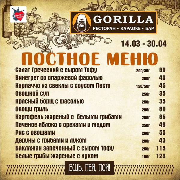 Для всех, кто придерживается предпасхального поста в ресторане-караоке-баре GORILLA приготовили аппетитное и сбалансированное постное меню.