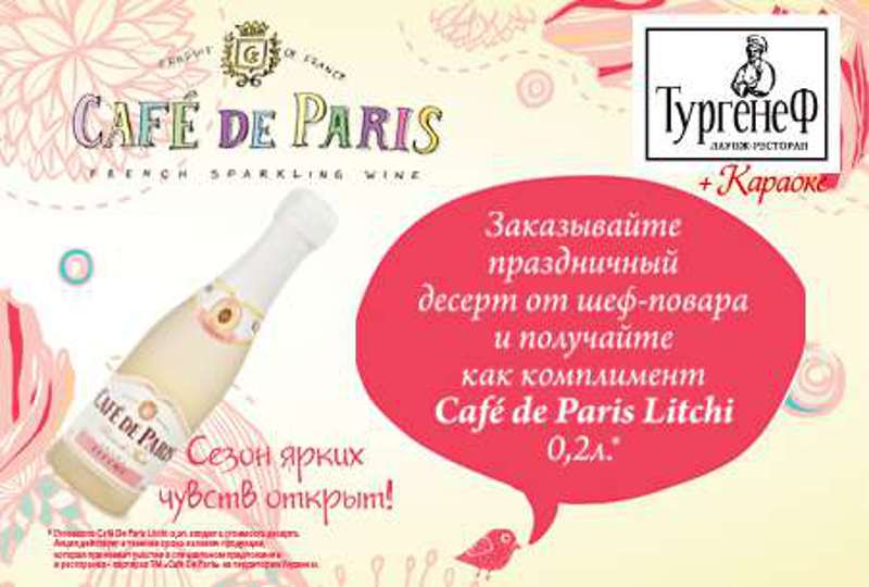 Весна объявляет ревизию старых впечатлений и дарит новые краски вместе с рестораном ТургенеФ. Закажите блюдо из  коллекции десертов и получите в подарок бутылочку охлажденного Cafe de Paris. Шеф-повар вложил в десерты  не только все свои знания и талант, но и привнес несколько модных ноток, которые обязательно станут трендом этого сезона в лучших ресторанах столицы. Изысканный напиток дополнит ваш выбор легким флером самого романтичного города мира – вечно молодого Парижа!