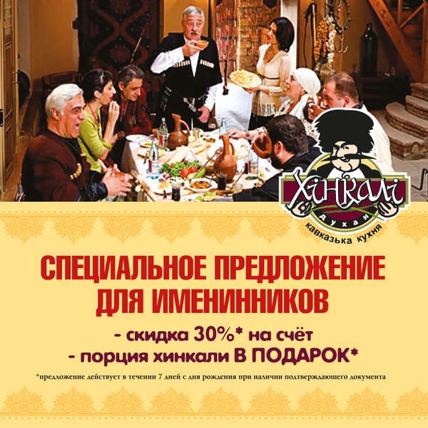 Если вы еще не решили где отпраздновать день рождения, приглашаем вас в грузинский ресторан Хинкали. По случаю такого чудесного дня, дарим вам 30% скидки на праздничный заказ и порцию вкуснейших хинкали со свининой и телятиной*