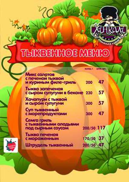 Обязательно попробуйте ароматный тыквенный суп с морепродуктами, тыкву запечённую с сыром сулугуни в беконе, изысканную семгу гриль с тыквенными оладьями под сырным соусом, а на десерт печеную тыкву с мороженным или тыквенный штрудель.