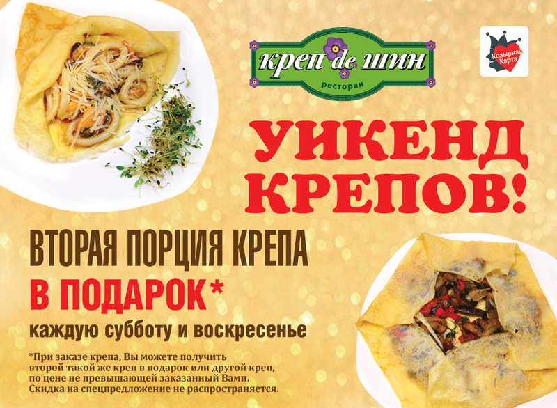 Приглашаем вас на уикенд крепов. Каждые выходные декабря, для всех гостей ресторана Креп де Шин, второй креп в подарок. *