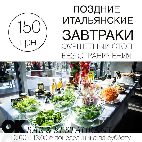 Теперь, каждый день, кроме воскресенья, с 10:00 до 13:00 поздний завтрак БЕЗ ОГРАНИЧЕНИЯ! Напитки: фреши, кофе, чай, какао, молоко, кефир или йогурт. Любимые завтраки: хлопья, круассаны с джемами на любой вкус, микс салат, свежие овощи, моцарелла, гренки со сливочным маслом, сыр, омлет с беконом и помидором, Глазунья, сосиски гриль и картофель фри - все это для вас в неограниченном количестве! Единая цена завтрака - 150 грн!