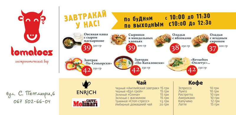 Именно так выглядит правильное начало дня. Завтракаем По-Сеньорски -глазуньей в болгарском перце или же По-Каталонски глазуньей со спаржевой фасолью. Для гурманов -овсяная каша с сыром Маскарпоне. Специальная цена на утренний кофе и чай.